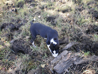 I saw Little Miss dig her first hole to bury something today. She got half of a dog biscuit. Gnawed on it for a bit, then went under the bush, dug a hole, and buried it. I wonder if she will find it again.